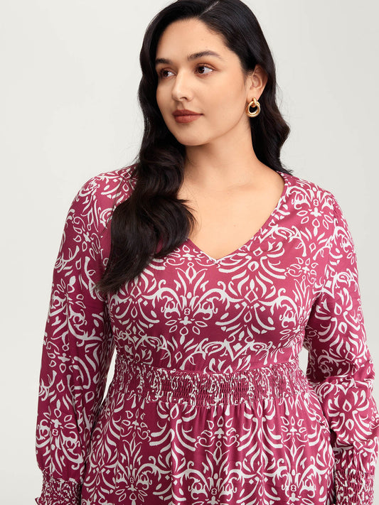 Abstract Pattern Shirred Waist Midi Dress