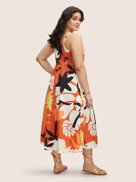 Tropical Print Back-Tie Shirred Midi Dress