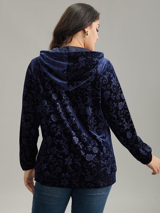Velvet Solid Floral Hooded Drawstring Sweatshirt