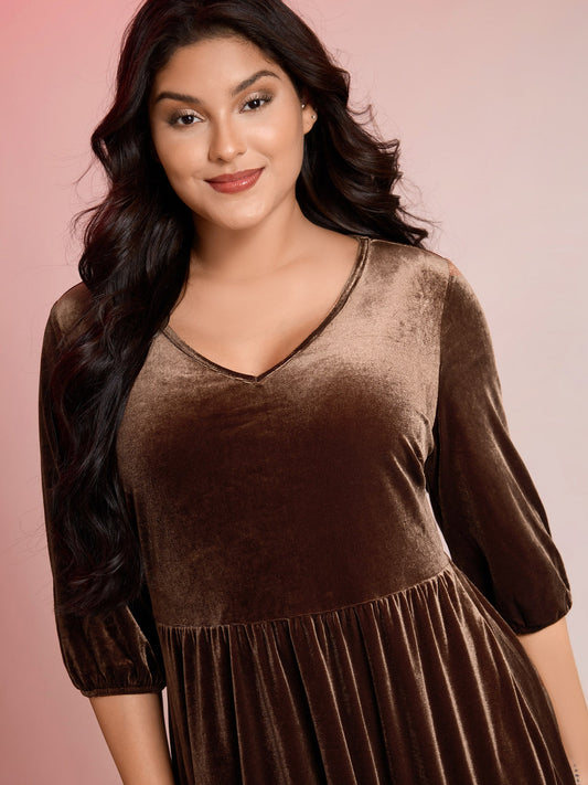 Velvet Shirred Waist Asymmetrical Hem Midi Dress