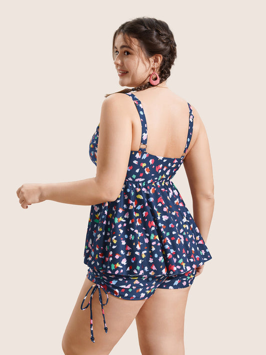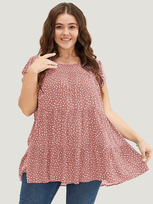 Allover Print Cap Sleeve Ruffle Hem Gathered Blouse