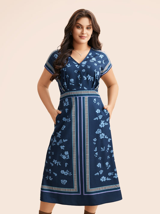 Boho Print Shirred Pockets Midi Dress