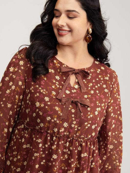 Bowknot Neckline Lace Trim Knee-Length Dress