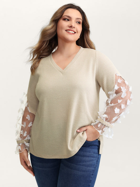 Floral Sheer Textured Sleeve V-Neck Sweatshirt