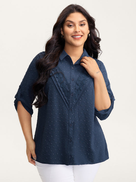 Plain Shirt Collar Shirred Button Up Ruffled Trim Blouse