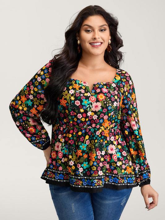 Floral Print Contrast Webbing Notched Neckline Blouse