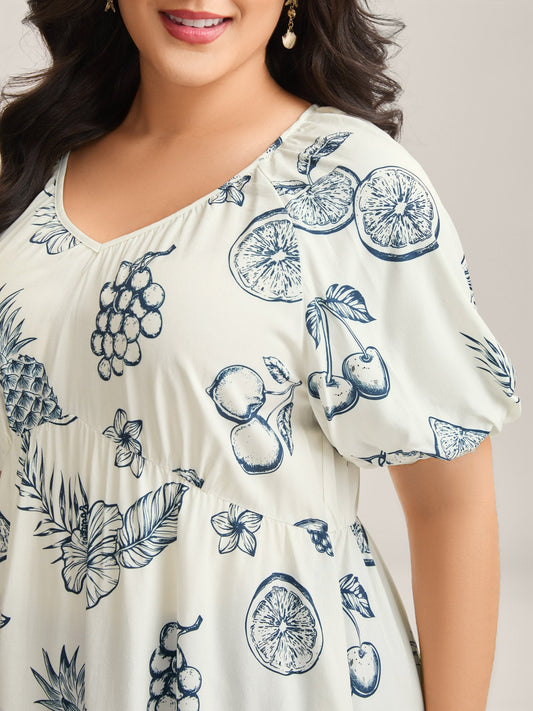 Fruity Print Bud Sleeve V-Neck Blouse