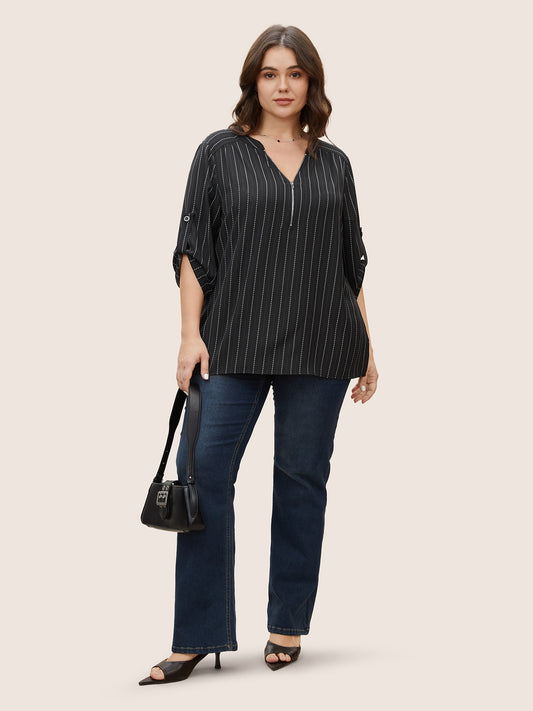 SAVE 50%Striped Half Zip Tab Sleeve Blouse