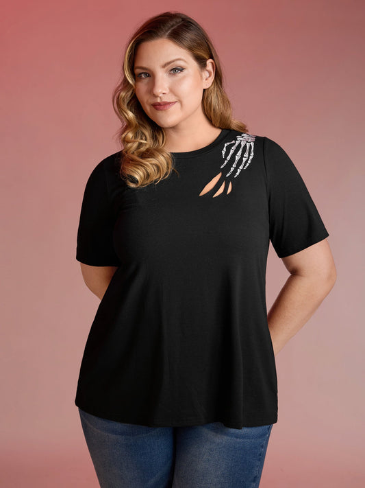 • Skeleton Hands Print Cut-Out Solid T-Shirt