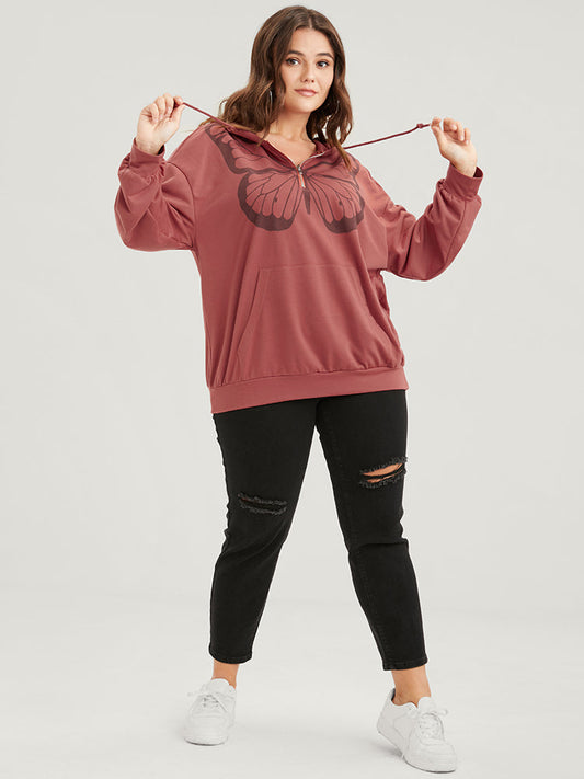 Butterfly Print Half Zipper Drawstring Hooded Sweatshirt