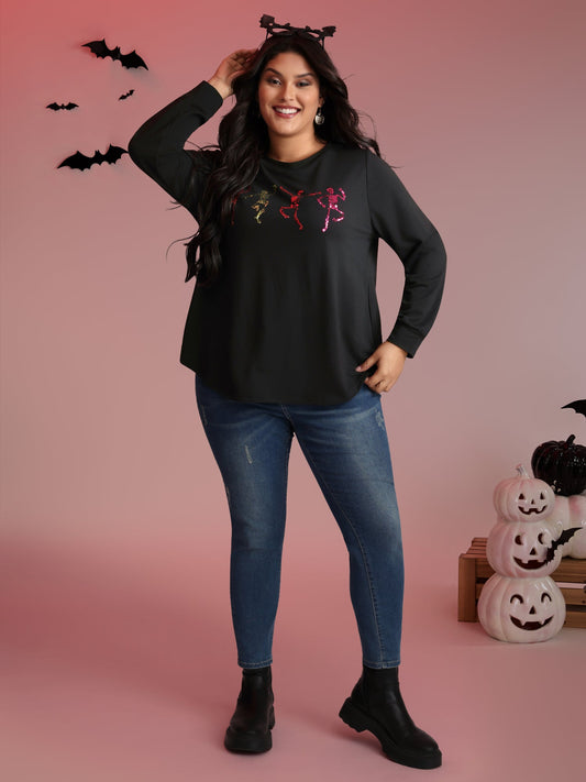 Spooky Skull Print Ribbed Hem Sweatshirt