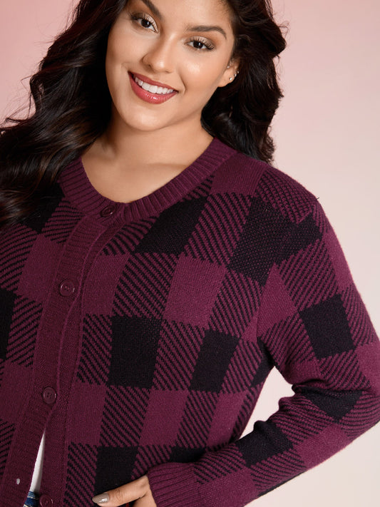 Checkered Jacquard Buttons Pockets Knit Cardigan