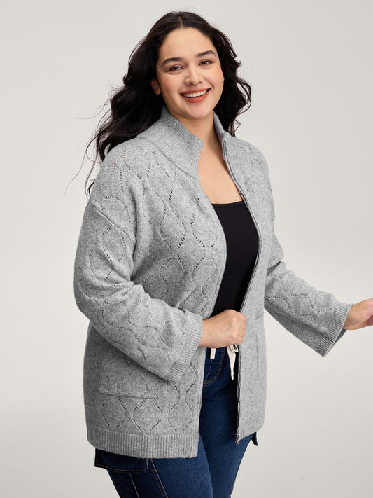 Plain Geometric Eyelet Cable Knit Tunic Cardigan
