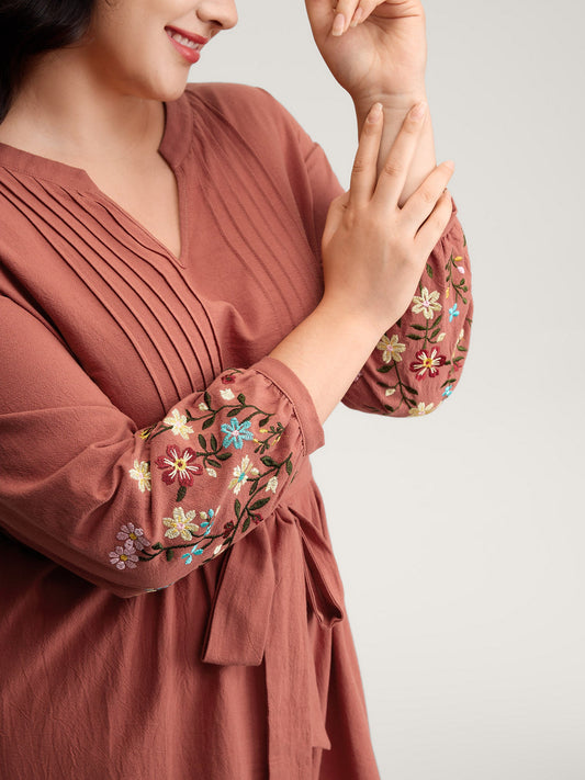 Cotton Embroidered Sleeve Waist-Tie Midi Dress