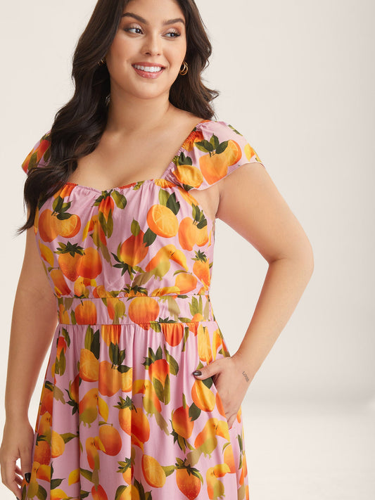 Ruffled Neck Off-Shoulder Floral Midi Dress
