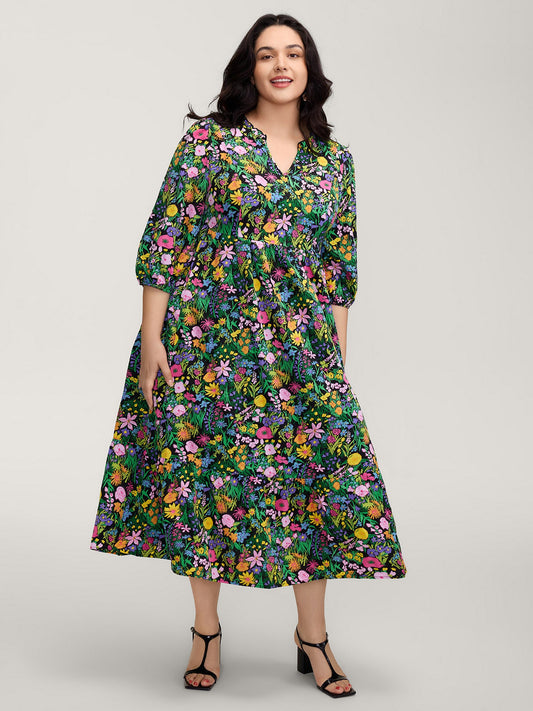 Velvet Floral Gathered Bodice Midi Dress