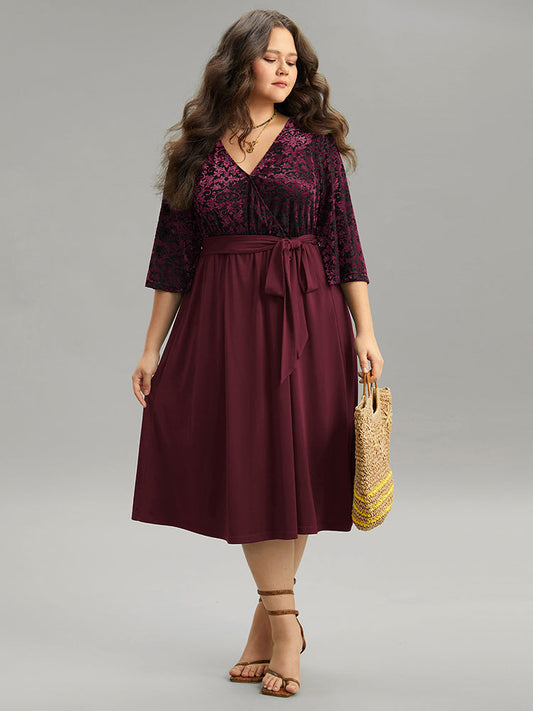 Silhouette Floral Print Belted Patchwork Velvet Dress