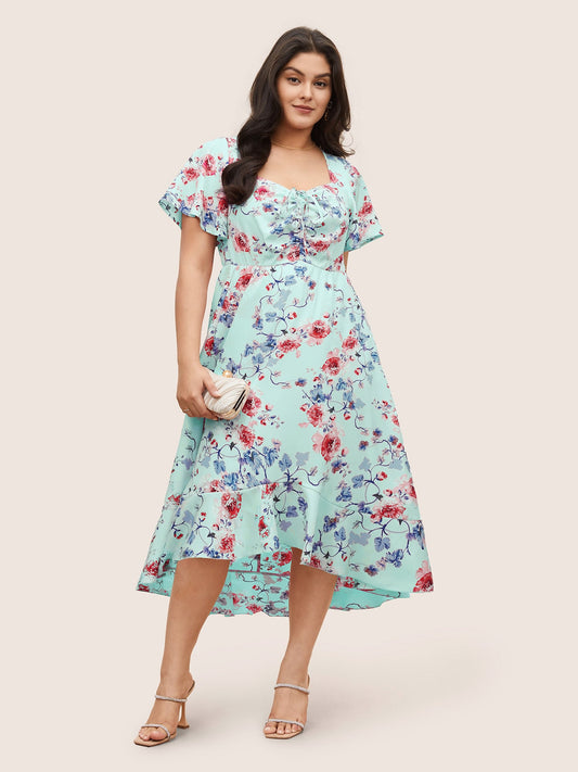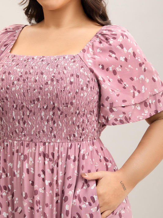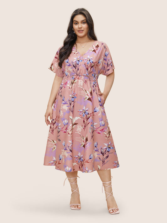 Floral Shirred Overlap Collar Elastic Waist Dress