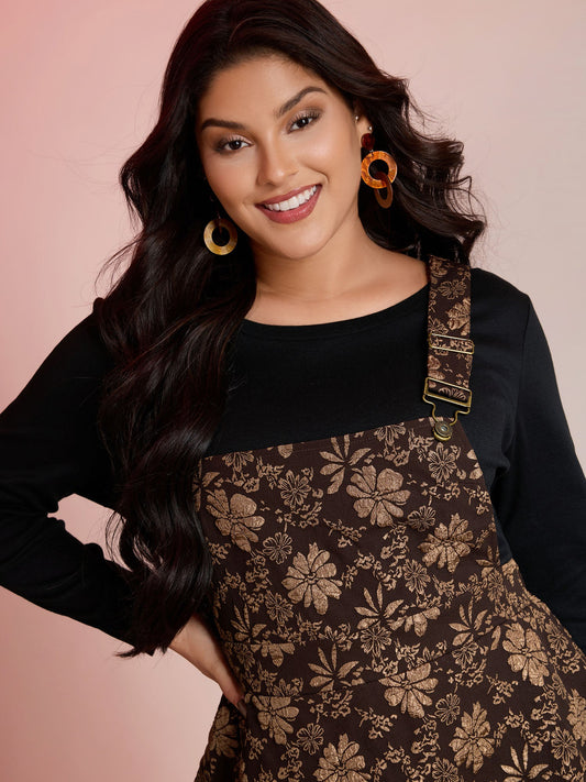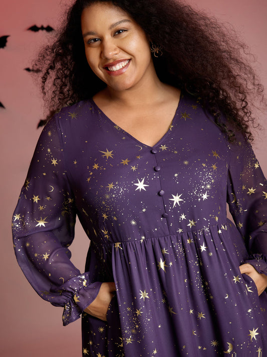 Gold Stamp Lantern Sleeve Ruffled Midi Dress