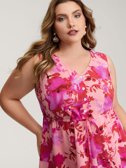 Floral Print Flowy Skirt Drawstring Maxi Dress
