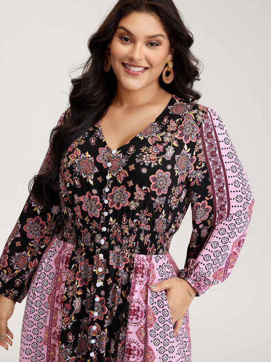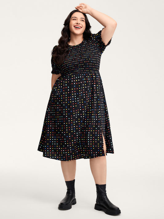 Colorful Polka Dots Shirred Bodice Midi Dress