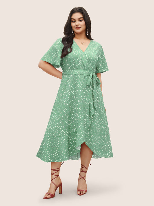 Polka Dot Surplice Neck Belted Arc Hem Dress