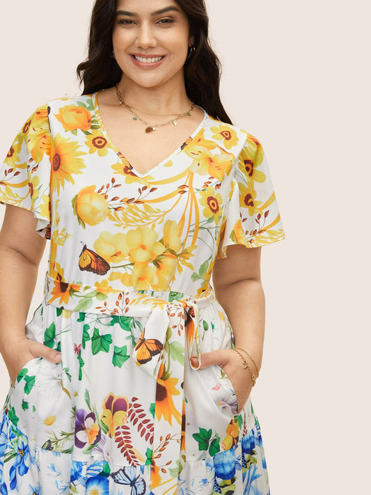 Floral & Butterfly Contrast Ruffle Layered Hem Dress