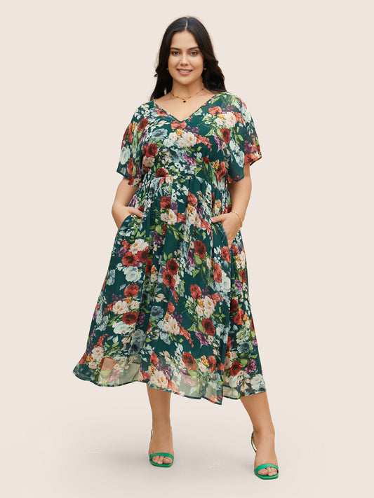 V Neck Chiffon Floral Dolman Sleeve Dress