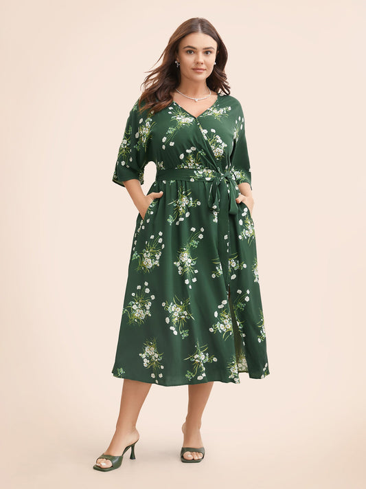 Boho Print Overlap Collar Dolman Sleeve Dress