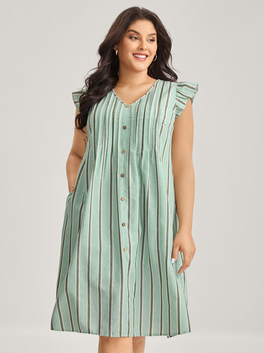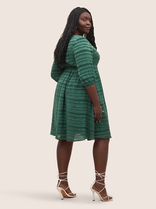 Striped Plisse Ties Pocket Lantern Sleeve Dress