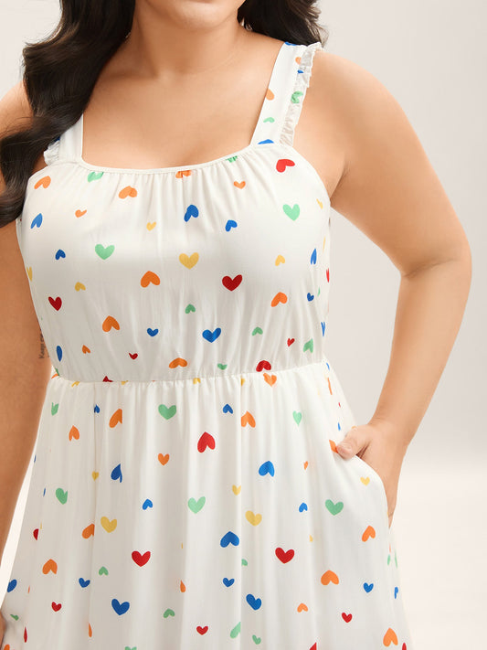 Solid Square Neck Button Up Pocket Ruffle Trim Cami Dress