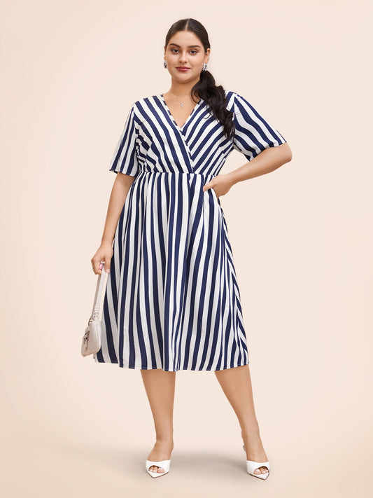 Striped Overlap Collar Ruffle Sleeve Midi Dress