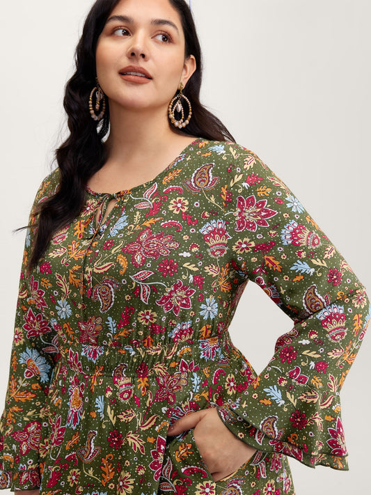 Floral Print Puff Sleeve Pocket Twist Front Dress