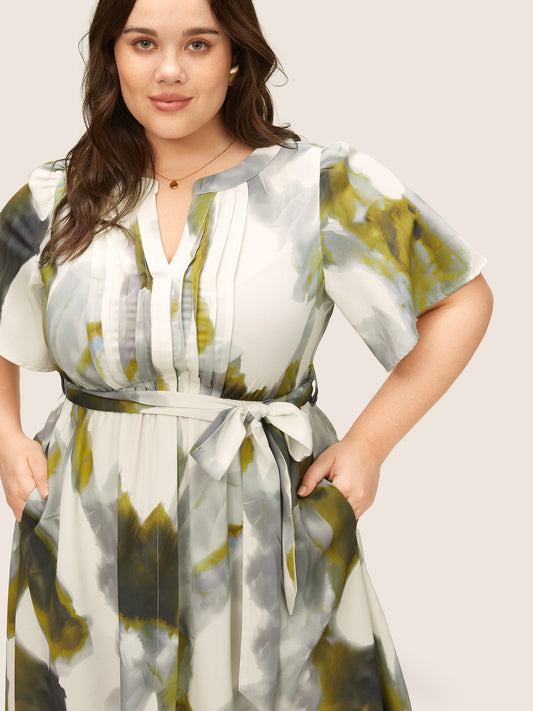Colorblock Notched Pleated Belted Curved Hem Dress