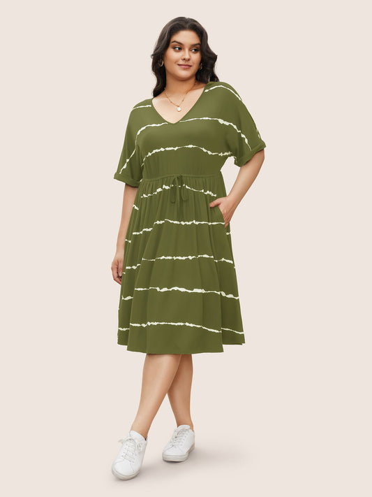 Tie Dye Roll Dolman Sleeve Pocket Gathered Knot Striped Dress