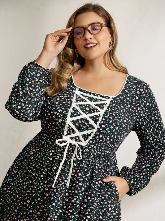 Ditsy Floral Patchwork Ruffle Layered Hem Dress