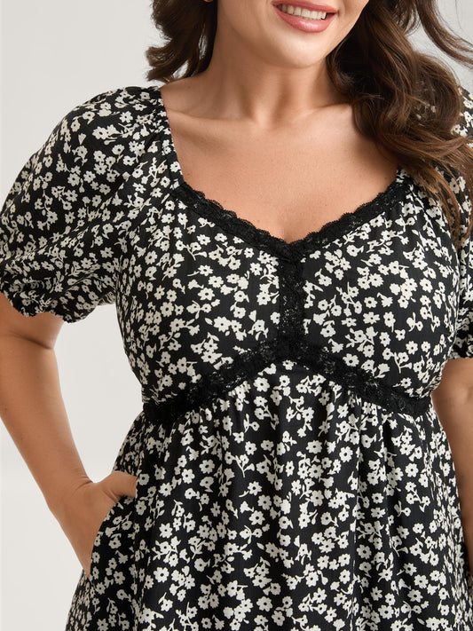 Ditsy Floral Print Lace Detail Midi Dress