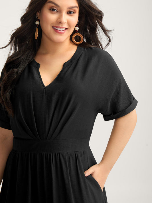 Pleated Cinched Waist Solid Midi Dress