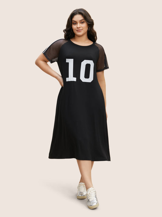 Number Print Striped Mesh Patchwork Midi Dress