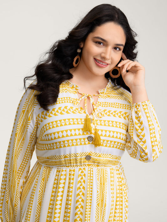 Notched Collar Geometric Striped Ruffle Sleeve Dress