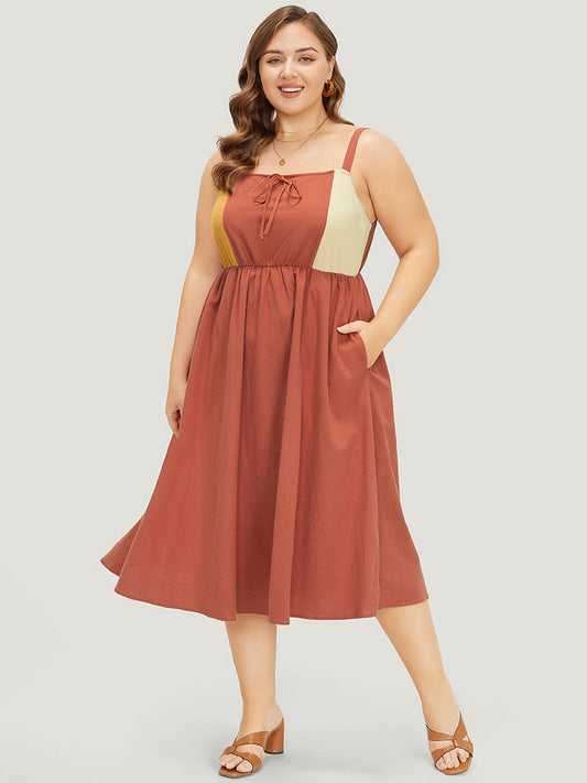 Color Block Contrast Pocket Flutter Hem Knot Cami Dress