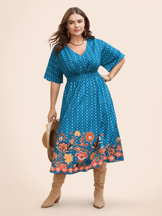 Boho Print Shirred Pleated Dolman Sleeve Dress