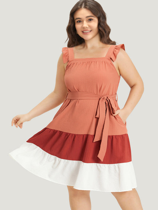 Contrast Ruffles Pocket Belted Square Neck Cami Dress