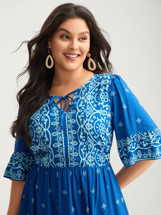 Bandana Print Ruffle Sleeve Pocket Tie Neck Tassels Dress