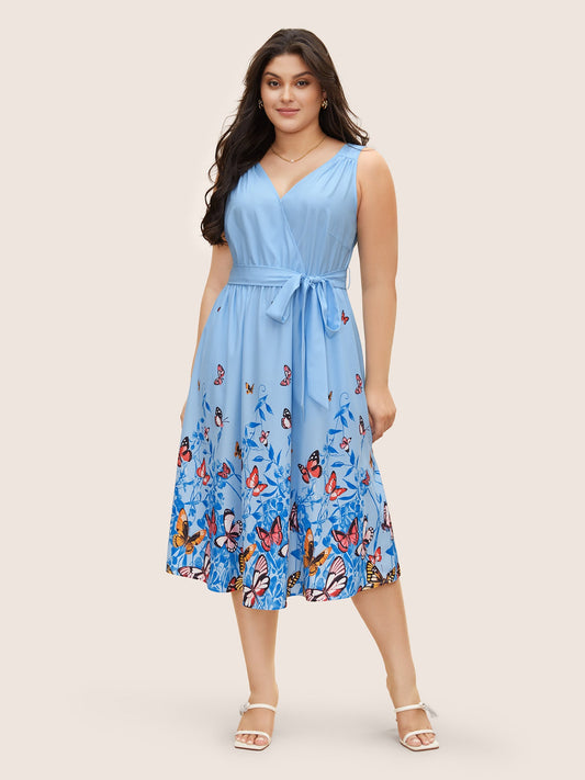 Butterfly Print Wrap Gathered Tank Dress