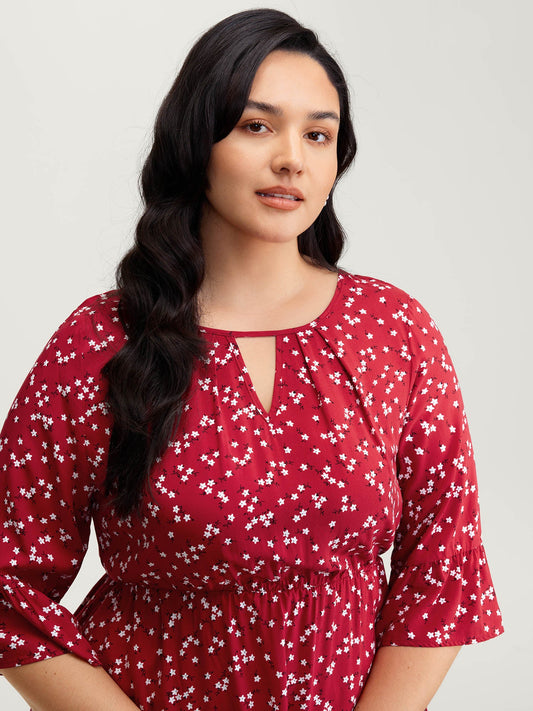 Floral Print Shirred Cut-Out Neck Midi Dress
