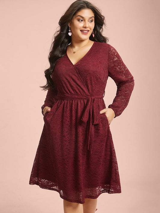 Crochet Lace Mesh Surplice Neck Belted Dress