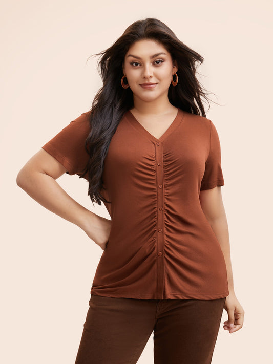 V Neck Button Detail Ruched T-shirt