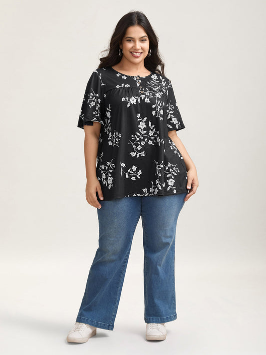 Floral Print Button Placket Pleated T-Shirt