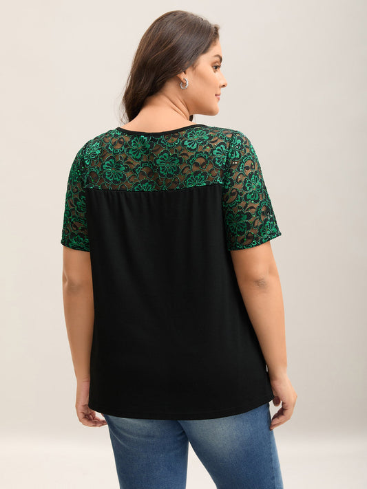 • Lace Neck Sequins Color Contrast T-Shirt